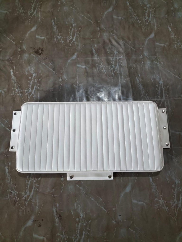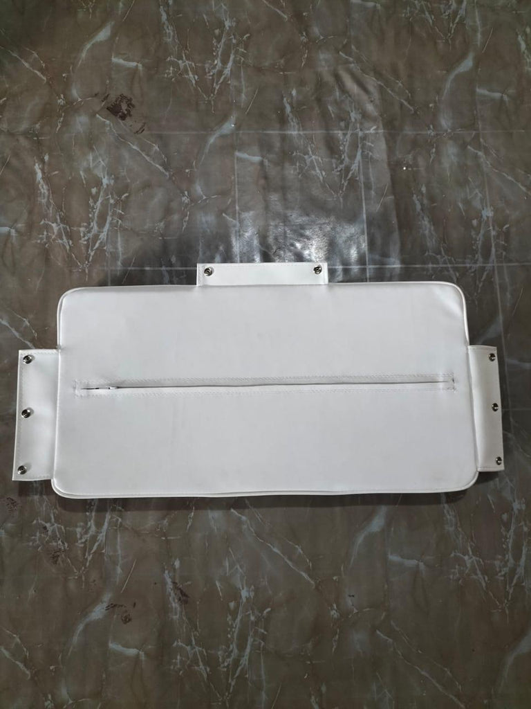 COMING WINTER 2026: Boston Whaler console cushion for Dauntless 16' and 18' (and possibly others). This foam core cushion attaches to the front of your fiberglass center console via top snaps and snap flaps that wrap around the sides and acts as a backrest for the cooler passenger. Made from UV resistant marine grade vinyl, 2" Ultra High density foam, and stainless hardware.
